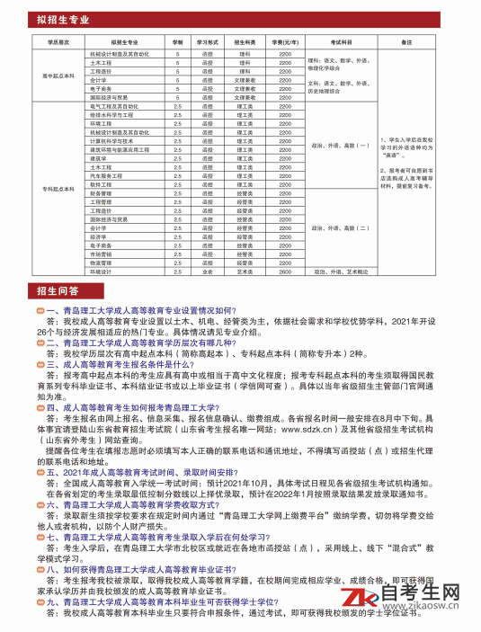 青岛理工大学于1961年创办了成人高等教育。50年来,学校继续教育在办学层次、办学形式、办学规模和办学质量等方面取得了长足的发展。目前,学院开设土木工程、建筑学、机械设计制造及其自动化、工程管理、国际经济与贸易、人力资源管理、物流管理等40多个本专科专业,有业余、函授两种学习形式,在籍学生近2万人。自1983年恢复成人教育以来,学院共培养了4万余名成人教育本、专科毕业生和1万余名专业证书班学生。