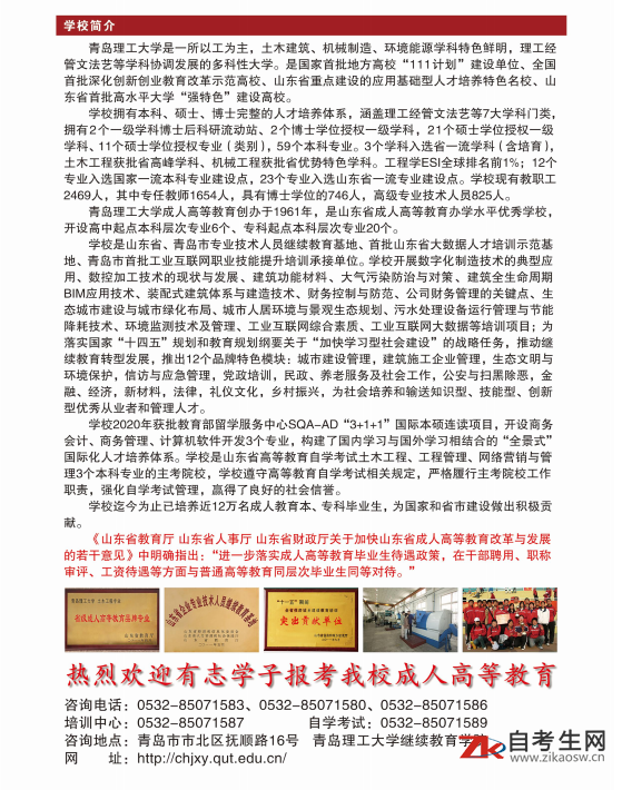 ★2007年以来,我院申报的成人教育土木工程(专科、本科)、机械设计制造及其自动化(专科、本科)专业被省教育厅批准为山东省成人高等教育品牌建设专业。