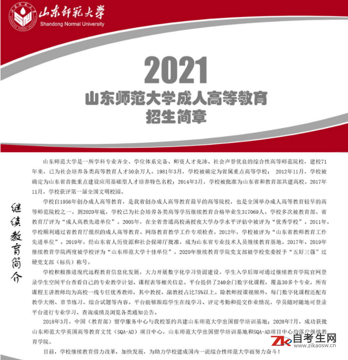 山东师范大学成人教育创始于1956年,1956年4月,受当时的山东省教育厅委托,学校创办函授教育,创立了建国后山东省第一个函授部。1958年5月,学校创办函授大学。1985年学校成立业余教育处,1986年改为成人教育处,1992年成立成人教育学院,1999年更名为继续教育学院。我校是山东省创办成人教育最早的高等院校,也是全国举办成人教育较早的高等师范院校之一。