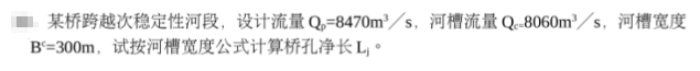 2、[主观题]【综合应用计算题】某桥跨越次稳定性河段,设计流量Q,=8470m3/s,河槽流量Q.-8060m3/s,河槽宽度B=300m,试按河槽宽度公式计算桥孔净长L。【原题截图】