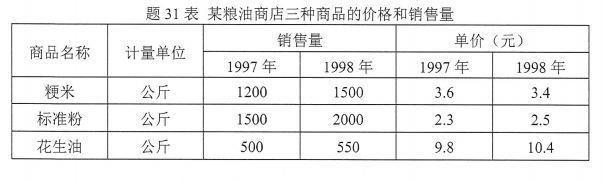 2、[主观题]【计算题】根据题31表中的数据,分别以基期销售量和零售价格为权数,计算三种商品的销售量综合指数。