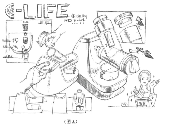2、[主观题]【案例分析题】图A为榨汁机手绘效果图,从表现手法、构图等方面进行分析,并指出其优缺点。