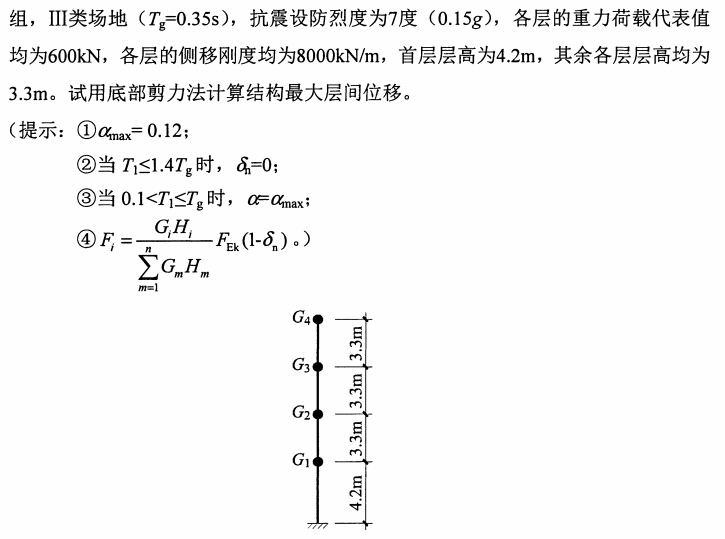 5、[主观题]【计算题】某多层结构计算简图如题39图所示。结构基本周期T₁=0.275s,设计地震分组为第一