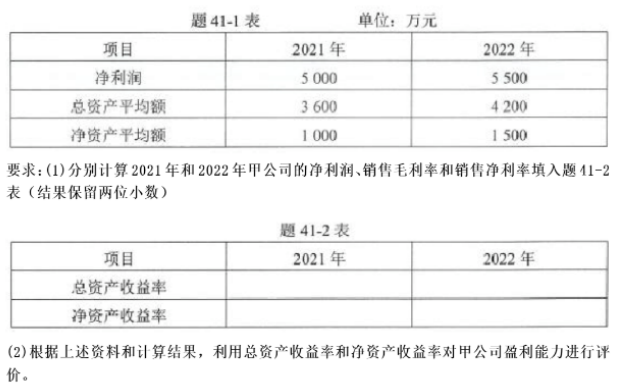 3、[主观题]【计算分析题】甲公司 2021-2022 年净利润、总资产平均额和净资产平均额如题 41-1 表: