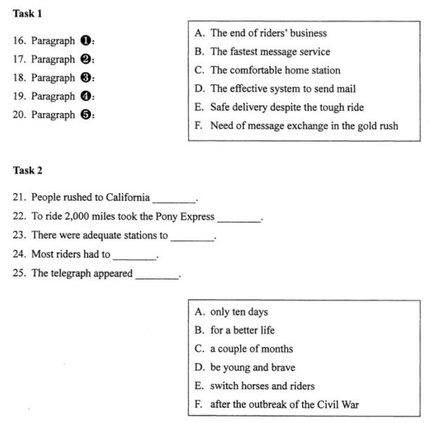 ①In 1848, gold was found in California. Thousands of people rushed there.But the trainline to California wasn't finished until 1869.It took a long time to ride a horse fromCalifornia to Missouri.What would you do if you wanted to send a message? well, you coulduse the Pony Express.
