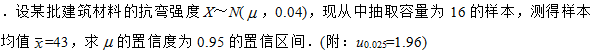 4、设离散型随机变量X的分布律为 A.0.3 B.0.4 C.0.6 D.0.7 5、设二维随机变量(X,Y)的概率密度为f(x, y)={1/4,0 A. B. C. D.1 6、设随机变量x服从参数为1/2的指数分布,则E (x)= A. B. C.2 D.4 7、设随机变量X与Y相互独立,且X~N (0,9),Y~N (0,1),令Z=X-2Y,则D (Z)= A.5 B.7 C.11 D.13 8、设(X,Y)为二维随机变量,且D (X)>0,D (Y)>0,则下列等式成立的是 A. B. C. D. 9、设总体X服从正态分布N(μ,σ2),其中σ2未知. x1, x2, ... xn为来自该总体的样本,x为样本均值,s为样本标准差,欲检验假设H0:μ=μ0,H1:μ≠μ0, 则检验统计量为 A. B. C. D. 10、设A,B为两个随机事件,若A发生必然导致B发生,且P (A)=0.6,则P (AB) =______. 11、设随机事件A与B相互独立,且P (A)=0.7,P (A-B)=0.3,则P (B) = ______. 12、己知10件产品中有2件次品,从该产品中任意取3件,则恰好取到一件次品的概率等于______. 13、设连续型随机变量X的概率密度为f(x)={1,0<=x<=1,则当0≤x≤1时,x的分布函数F(x)=____ 14、设随机变量X~N(1,32),则P{-2≤ X ≤4}=______.(附:Φ=0.8413) 15、设二维随机变量(X,Y)的分布律为 16、设随机变量X的期望E (X )=2,方差D (X )=4,随机变量Y的期望E (Y )=4,方差D (Y)=9,又E (XY )=10,则X,Y的相关系数p= ______. 17、设随机变量X~B (100,0.5),应用中心极限定理可算得P{40 18、设总体X~N(1,4),x1,x2,…,x10为来自该总体的样本,x=1/10Σxi,则D(x)=____ 19、设总体X~N (0,1),x1,x2,…,x5为来自该总体的样本,则Σxi服从自由度为______ x2的分布. 20、设总体x服从均匀分布U(θ.2θ), x1, x2, ... xn是来自该总体的样本,则θ的矩估计θ=____ 21、【计算题】设变量y与x的观测数据( xi,yi)(i=1,2,…,10)大体上散布在某条直线的附近,经计算得出 22、【计算题】设一批产品中有95%的合格品,且在合格品中一等品的占有率为60%. 23、【综合题】设随机变量X的概率密度为f(x)={A,-2<=x<=2,0.其他 24、【综合题】设某型号电视机的使用寿命X服从参数为1的指数分布(单位:万小时). 25、【应用题】设某批建筑材料的抗弯强度X~N(μ,0.04),现从中抽取容量为16的样本,测得样本均值x=43,求μ的置信度为0.95的置信区间. (附:u0.025=1.96)