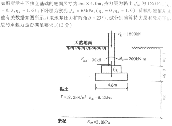 24、【计算题】如图所示柱下独立基础的底面尺寸为3m x 4.6m ,持力层为黏土.Ja为 155kPa , ( T7,= 0.3 ,7i= 1.6);下卧层为淤泥,f = 65kPa,( 7p= 0 ,7)a= 1.O);荷载标准值及其他有关数据如图所示。(取地基压力扩散角0 = 23°) ,试分别验算持力层和软弱下卧层的承载力是否满足要求。