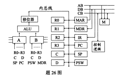 20、【简单应用题】设有计算机的CPU数据通路及其与存储器的连接结构如下图所示,其中,R0~R3为通用寄存器,IR为指令寄存器,PC为程序计数器,SP为堆栈指针,C和D为暂存器,MAR为存储器地址寄存器,MDR为存储器数据缓冲寄存器。