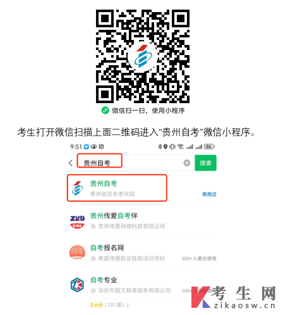 考生在规定时间内登录“贵州自考”微信小程序(扫描下方二维码或通过微信搜索小程序“贵州自考”),按照“贵州自考”微信小程序提示进行注册报名。