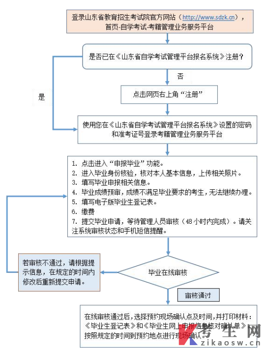 本次毕业申报采用网上申报方式进行。考生登录山东省教育招生考试院网站(https://www.sdzk.cn/),在首页底部考试导航栏中选择"自学考试—考籍管理业务服务平台"进入"山东省高等教育自学考试考籍信息服务平台",注册并登录成功后,选择毕业申报栏中"申报毕业"进行网上申报。