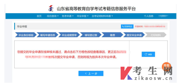 2025年下半年山东兖州区自考毕业申请审核如果反馈结果为不通过,考生可以该页面上的查看原因按钮,查看具体原因,根据提示,在规定时间内修改后重新提交申请即可。