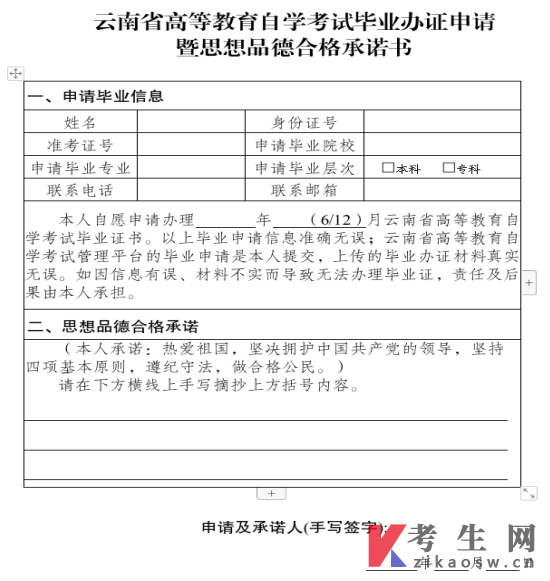 办理云南自考毕业申请的考生在规定的时间内,登录"云南省高等教育自学考试管理平台"进行网上申报的时候,完成上传证明材料环节后,就可以来签署云南省高等教育自学考试毕业办证申请暨思想品德合格承诺书环节,考生先下载《云南省高等教育自学考试毕业办证申请暨思想品德合格承诺书》之后,填写完整,手写签字后扫描上传。