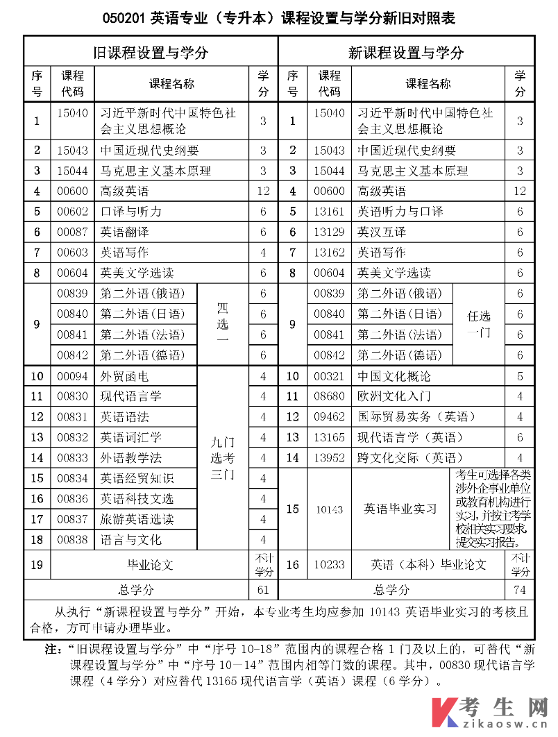 | 14 | 10143 | 英语毕业实习 | 考生可选择各类涉外企事业单位或教育机构进行实习, 并按主考学校相关实习要求,提交实习报告。 | |