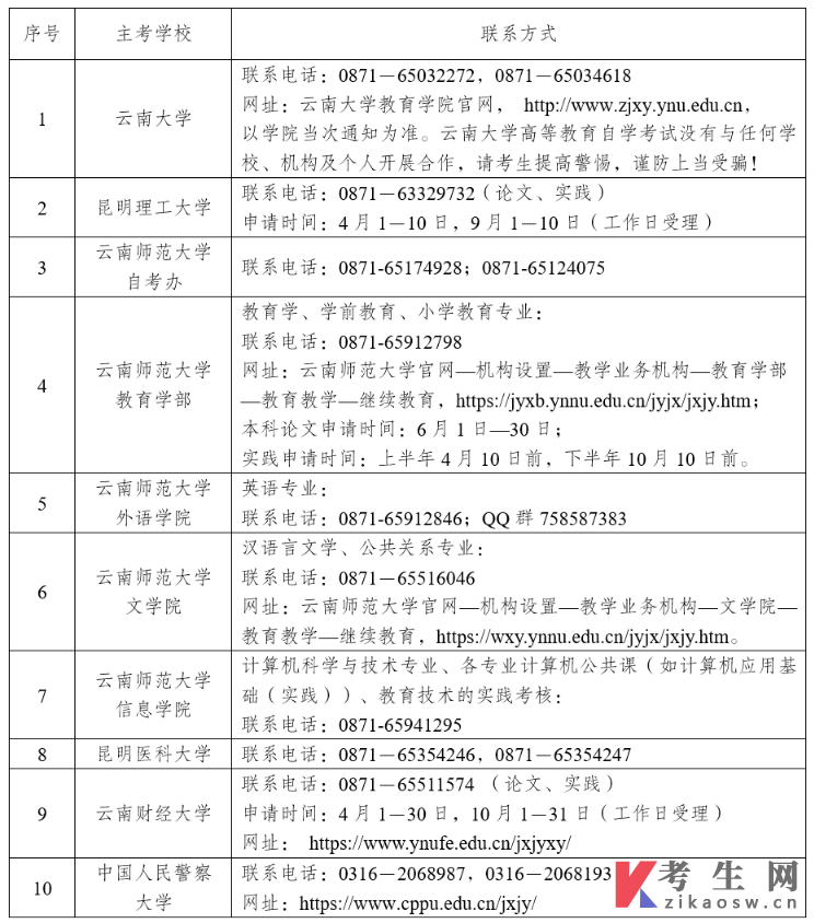 七、云南省高等教育自学考试各专业实践性环节考核、论文答辩联系方式: